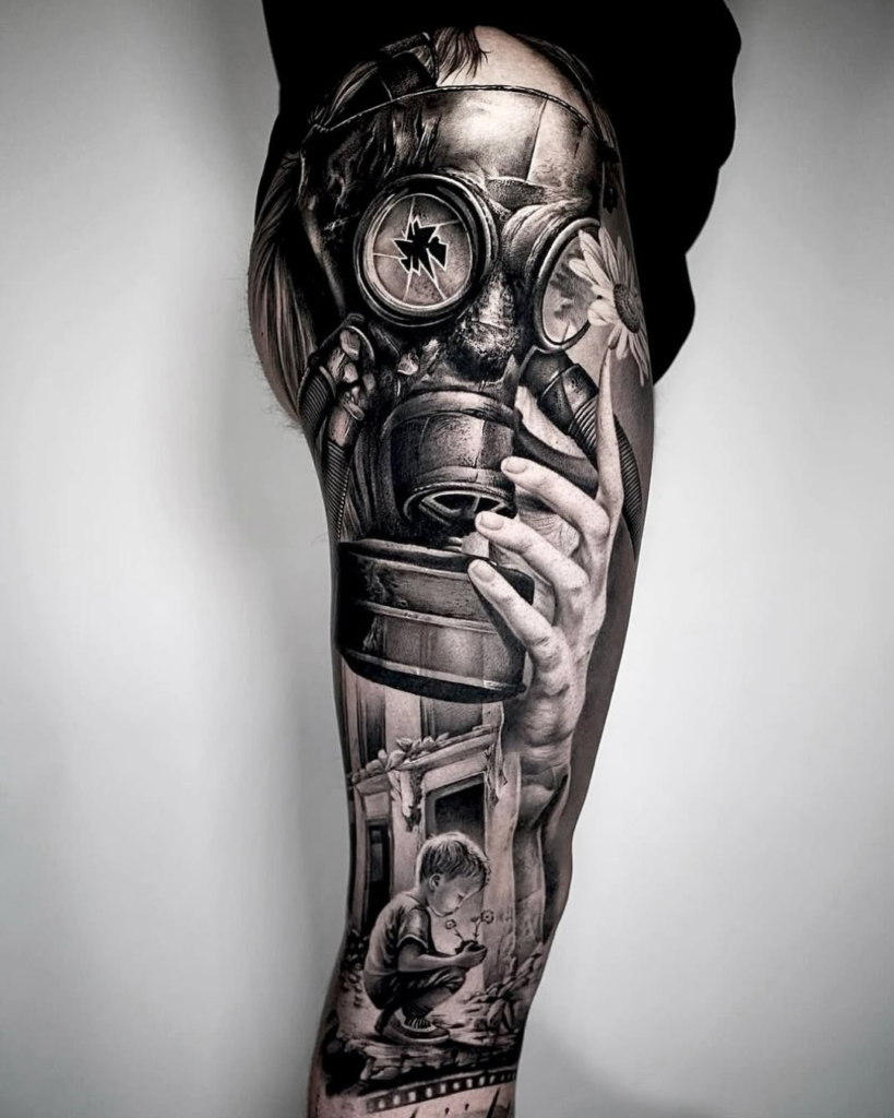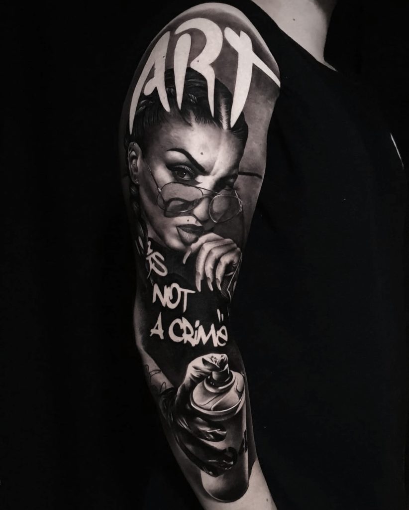 Fotorealismus in Perfektion. Nelson beherrscht realistische Motive und schwarz-weiße Kunst wie kein Zweiter. Seine Tattoos wirken lebendig und plastisch.